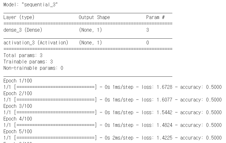 ##binary classification import tensorflow as tf #1.dataSet ์ค์ x_data = [[1, 2],[2, 3],[3, 1],[4, 3],[5, 3],[6, 2]] y_data = [[0], [0], [0], [1], [1], [1]] #2.Model ๊ตฌ์ฑ tf.model = tf.keras.Sequential() tf.model.add(tf.keras.layers.Dense(units=1, input_dim=2)) tf.model.add(tf.keras.layers.Activation('sigmoid')) #3. Model ํ์ต๊ณผ์ ์ค์ tf.model.compile(loss='binary_crossentropy', optimizer=tf.keras.optimizers.SGD(lr=0.01), metrics=['accuracy']) #4. Model ์ถ๋ ฅ tf.model.summary() #5. Model ํ์ต history = tf.model.fit(x_data, y_data, epochs=100)#return np.array #6. Model ์ฌ์ฉํ๊ธฐ print("Accuracy: ", history.history['accuracy'][-1])Result