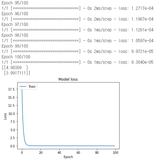 ##Graph ๊ทธ๋ฆฌ๊ธฐ import numpy as np import tensorflow as tf import matplotlib.pyplot as plt #1.data set ์ค์ x_train = [1, 2, 3, 4] y_train = [1, 2, 3, 4] #2.Model ๊ตฌ์ฑ tf.model = tf.keras.Sequential() # units == output shape, input_dim == input shape tf.model.add(tf.keras.layers.Dense(units=1, input_dim=1)) #3. Model ํ์ต๊ณผ์ ์ค์ # SGD == standard gradient descendent, lr == learning rate sgd = tf.keras.optimizers.SGD(lr=0.1) # mse == mean_squared_error, 1/m * sig (y'-y)^2 tf.model.compile(loss='mse', optimizer=sgd) # prints summary of the model to the terminal tf.model.summary() #4. Model ํ์ต # fit() trains the model and returns history of train history = tf.model.fit(x_train, y_train, epochs=100) #6. Model ์ฌ์ฉํ๊ธฐ # predict() returns predicted value y_predict = tf.model.predict(np.array([5, 4])) print(y_predict) # Plot training & validation loss values plt.plot(history.history['loss']) plt.title('Model loss') plt.ylabel('Loss') plt.xlabel('Epoch') plt.legend(['Train', 'Test'], loc='upper left') plt.show()Result
